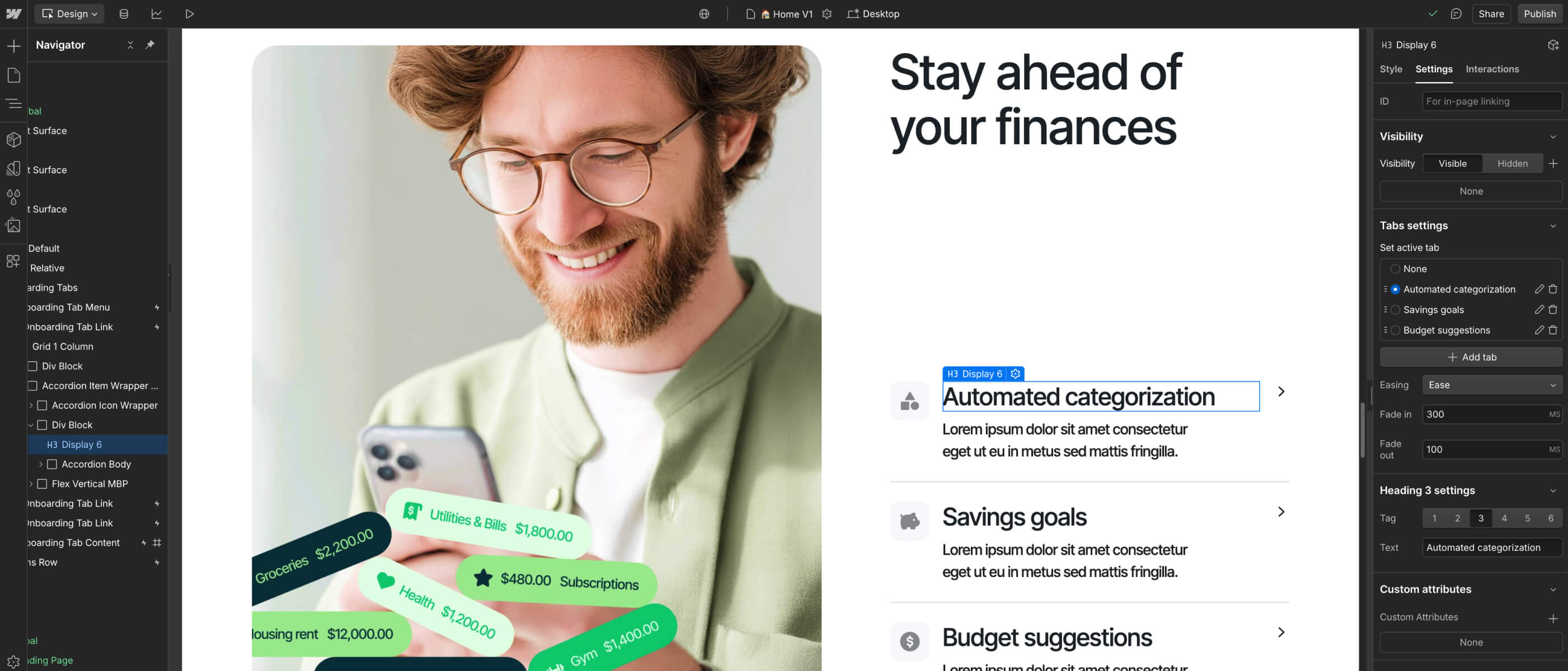 If you would like to edit any template Interaction (i.e. removing a appear effect), you can easily identify elements that have interactions as these have a small Interactions icon (a small thunder) in the left sidebar Navigator.