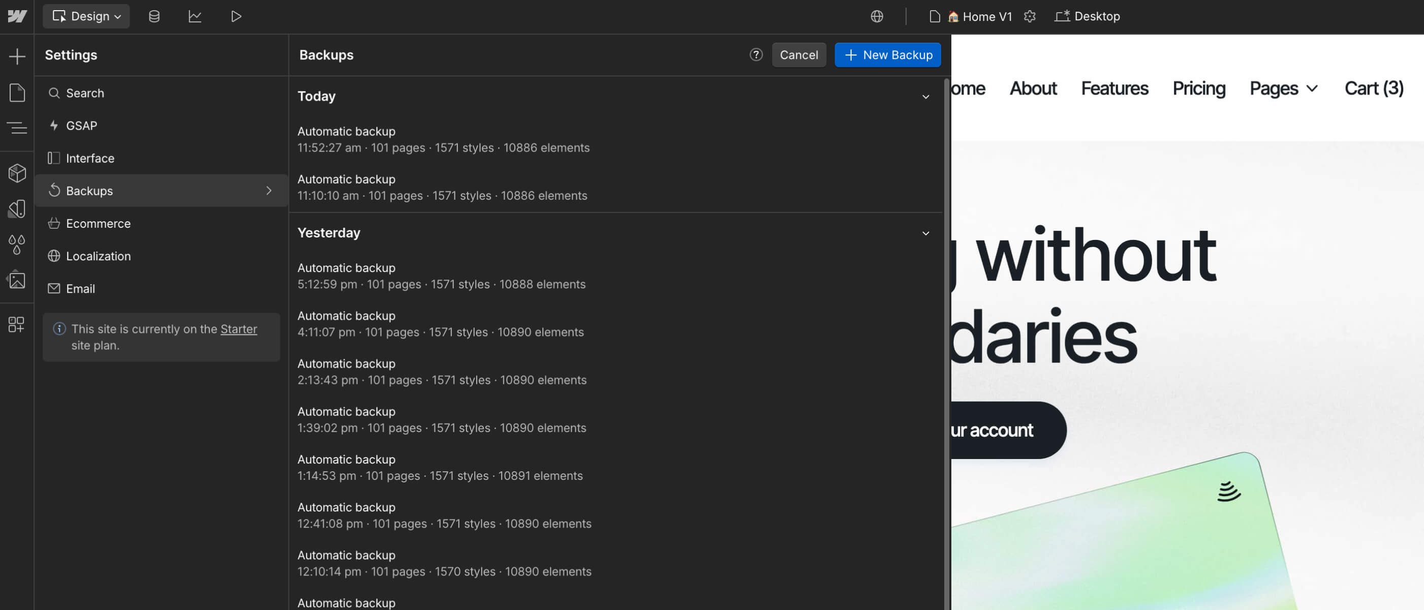 If something goes wrong, for example, if you are not liking where the website is going to, if you deleted some critical classes that were required to make the Template look nice, or if you just want to go to a previous version for any reason, you can always go to the Backups section.
